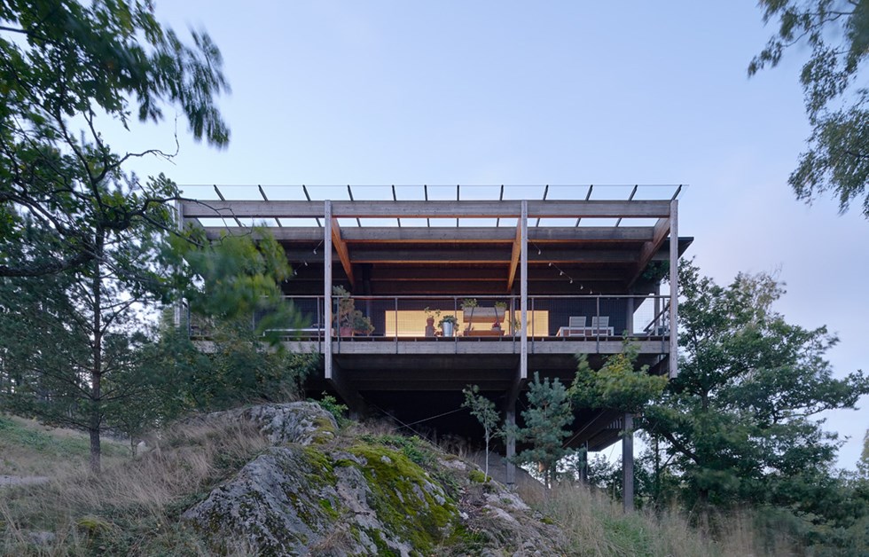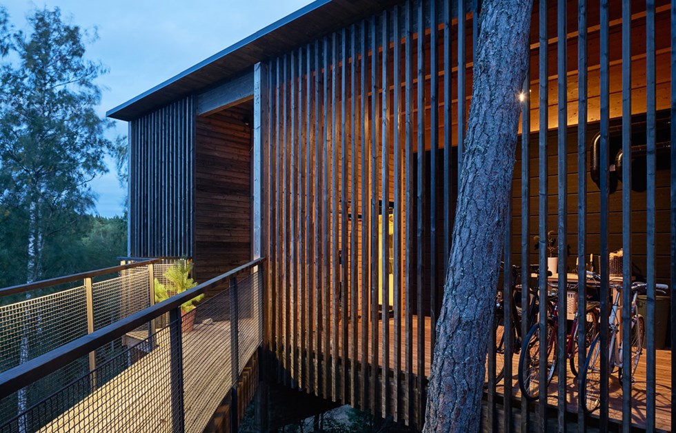 Just outside the centre of Trosa, almost 30 metres above sea level, rises Emils Backe, a wide and hilly landscape of forests and fields. Uninterrupted views take in the harbour and Tureholmsviken. The buildings on Emils Backe combine energy efficient homes in eco-friendly building materials with innovative architecture in harmony with nature. The buildings use a smart and inventive construction system that employs lightweight I-beams, combined with a strong external skeleton of glulam that minimises the occurrence of thermal bridges. Putting the houses on stilts allows the natural assets to be kept largely intact and makes it easy to build in difficult terrain.