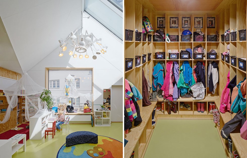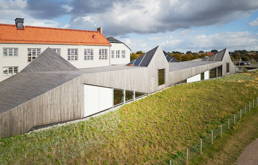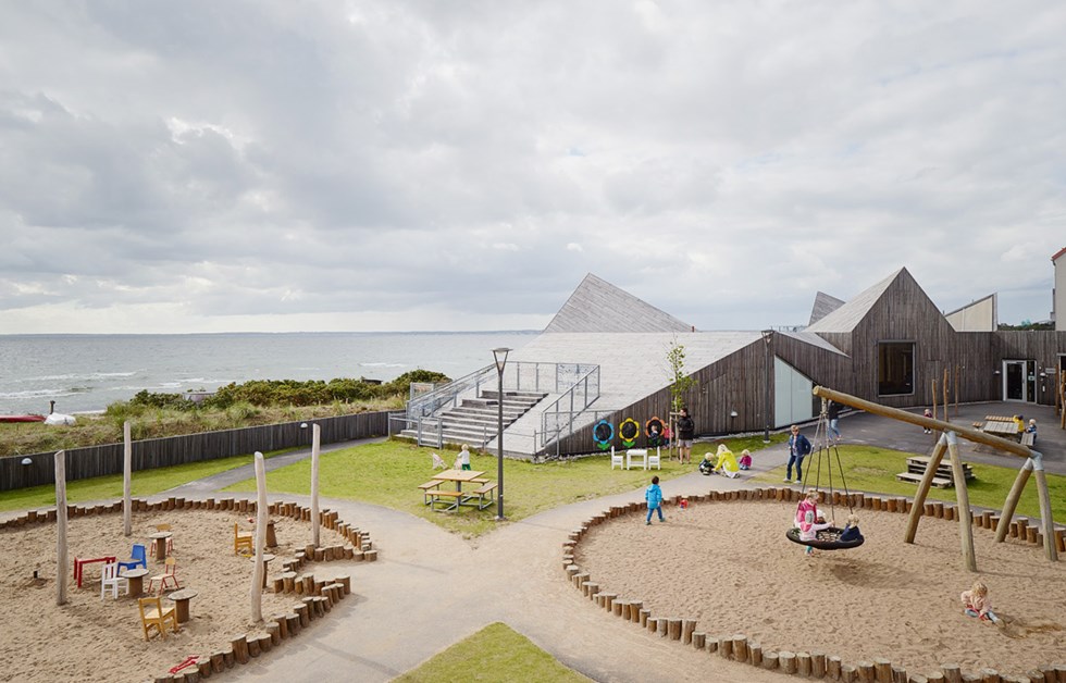 Råå Preschool takes its cues from the surrounding landscape, the gently sloping sand dunes and the distinctive typology of the fishermen’s huts. Four classes, each with their own room, are represented in the façade by the gables that echo those fishermen’s huts. Large windows in the façade and roof establish contact with the sea and the surrounding landscape, while also providing optimum daylight all year round. Sheltered from the Öresund strait is a natural playground. Much of the design work involved creating spaces that enable children and adults to embark on their own adventures.