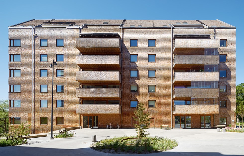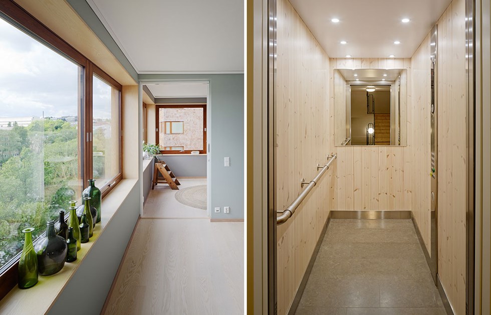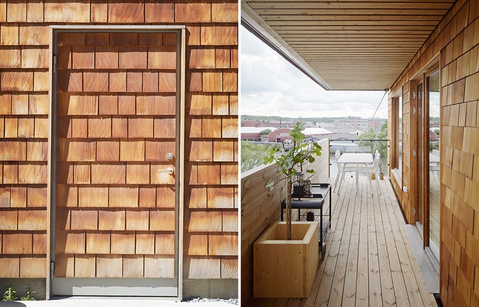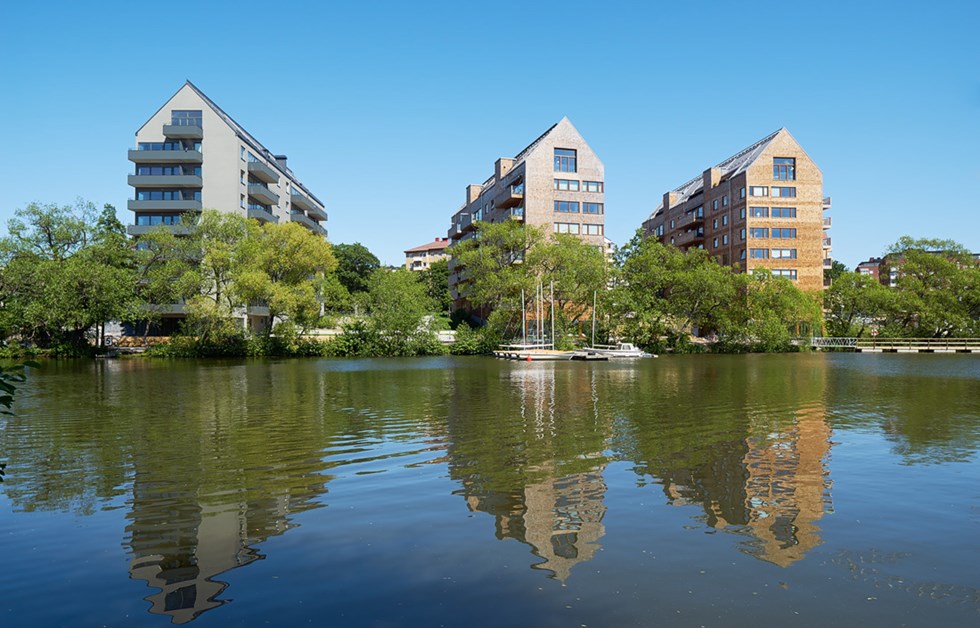 Strandparken’s location on the sunny side of Bällstaviken marked the starting point for the design. Contact with the water, sightlines, the sun, the surrounding area and the mature trees helped to determine the position of the buildings. The steeply pitched roofs of the apartment blocks have discrete eaves. The material count is low and the attention to detail is high. The structural frame is solid wood, with wooden façades that give the buildings a time-honoured and characterful appearance. Balconies with glass ends overlooking the water provide both views and privacy. Large areas of glass, with sliding doors onto the balcony or roof terrace, extend the apartments and give them a sunny outdoor space that offers contact with the water.