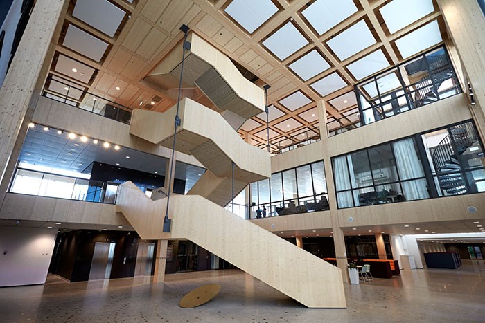 Stabilisation achieved via: Plane element action in the floor structure, whereby horizontal loads are channelled down to the ground via crosslam walls, braces, lift shafts and stairwells.