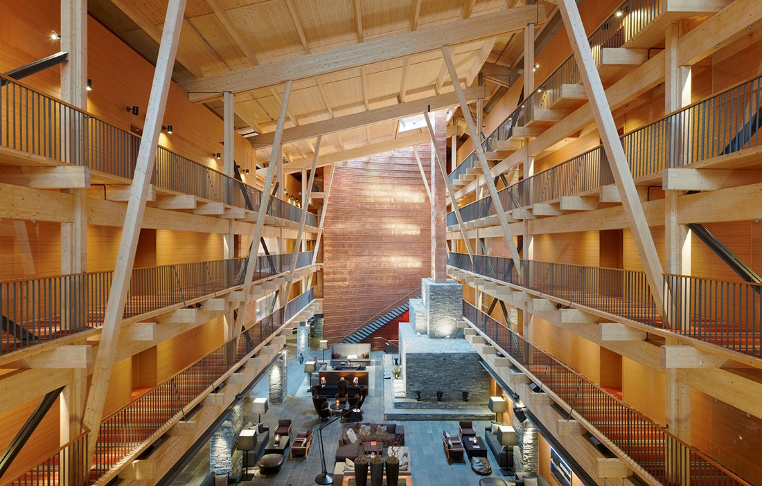 Cooper Hill Mountain Lodge is nestled just beneath the crest of Mount Forberget and looks onto celebrated Mount Åreskutan to the west. The main level, centered around a formidable stone fireplace, is a grand gathering space. The atrium and roof are an articulated frame of pine that envelops two slim wings. Copper Hill Mountain Lodge was nominated for the Swedish Wood Award in 2012.