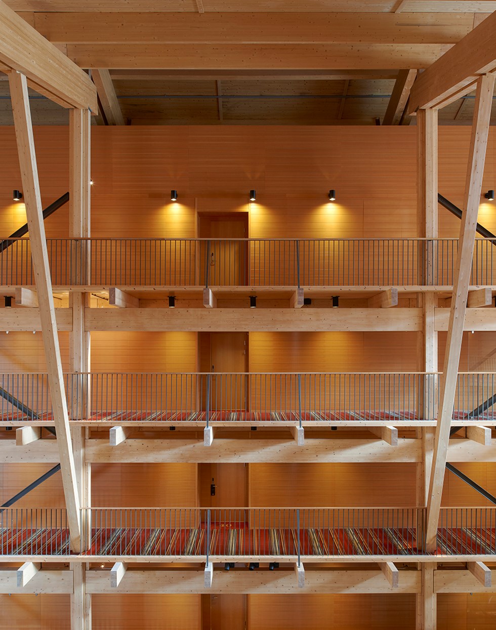 Exposed glulam structure made of spruce, massive wood floor boards, walls and ceilings clad in Oregon pine.