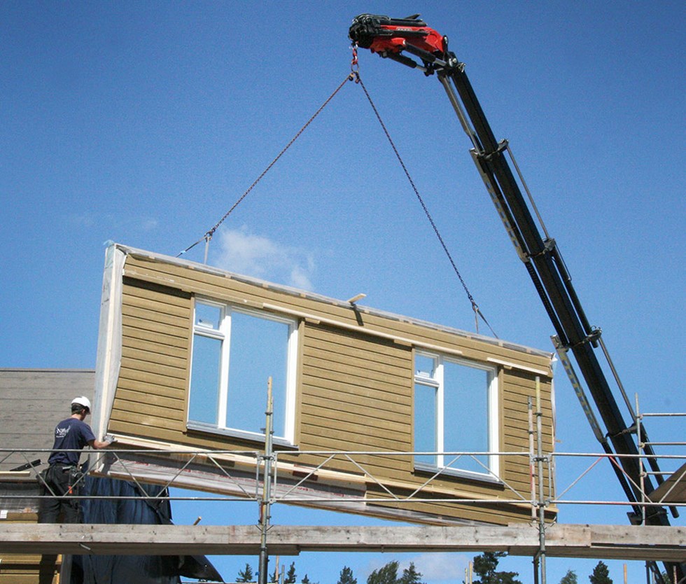 A closed panel, built with high precision in a factory, is delivered to the construction site for immediate assembly.