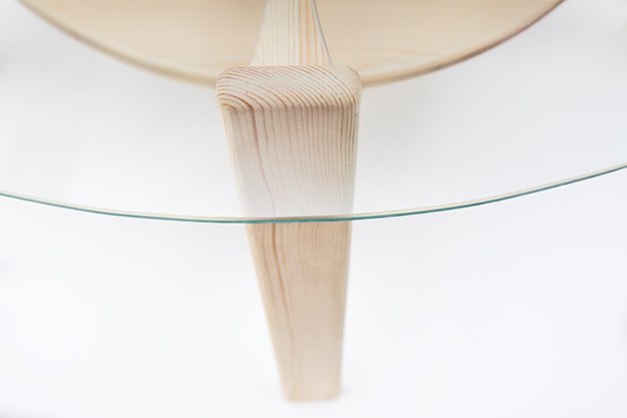 The legs made of Swedish Pine are displayed through the glass table top. A hint of Swedish forestry in the wooden legs together with the airy glass surface creates a pure Scandinavian feel.