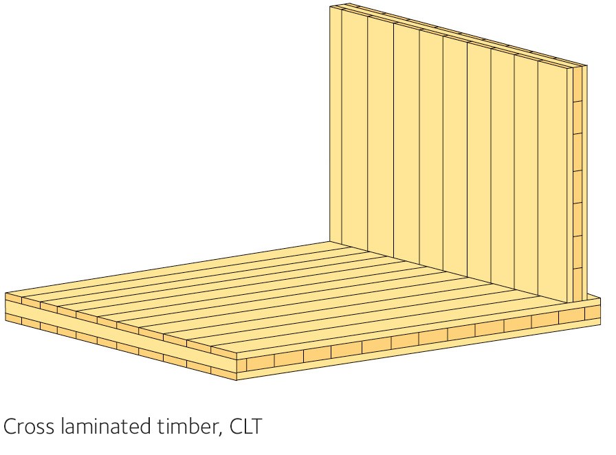 CLT is a sheet material comprising at least three layers of glued boards or planks, usually made from pine or spruce, with each layer placed at 90 degrees to the next. CLT products are made primarily to a common European standard and meet the product properties declared by the manufacturer in their European Technical Approval (ETA)* or in a type approval.