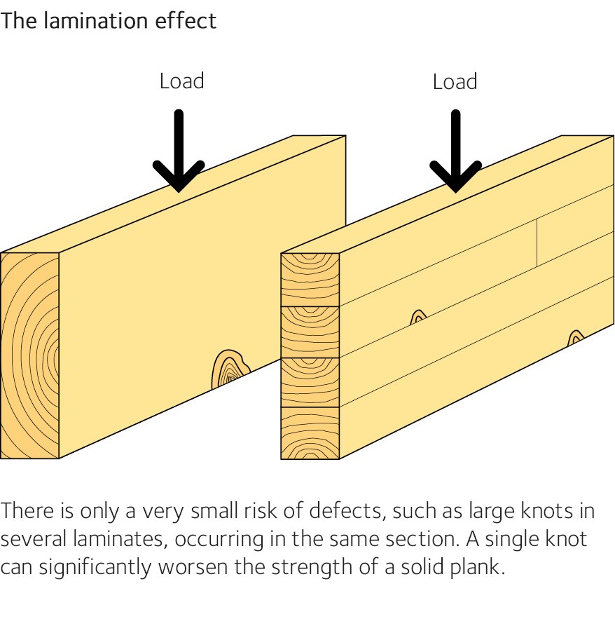 The high strength and stiffness of glulam enables large unsupported spans to be achieved. With construction timber, the strength of an individual plank is determined by the weakest cross-section – usually at a large knot or area of cross-grain. The strength of different planks can vary significantly. On average, glulam elements are both stronger and stiffer than an individual plank of the same dimensions. This is because of the lamination effect, which can briefly be explained as follows: