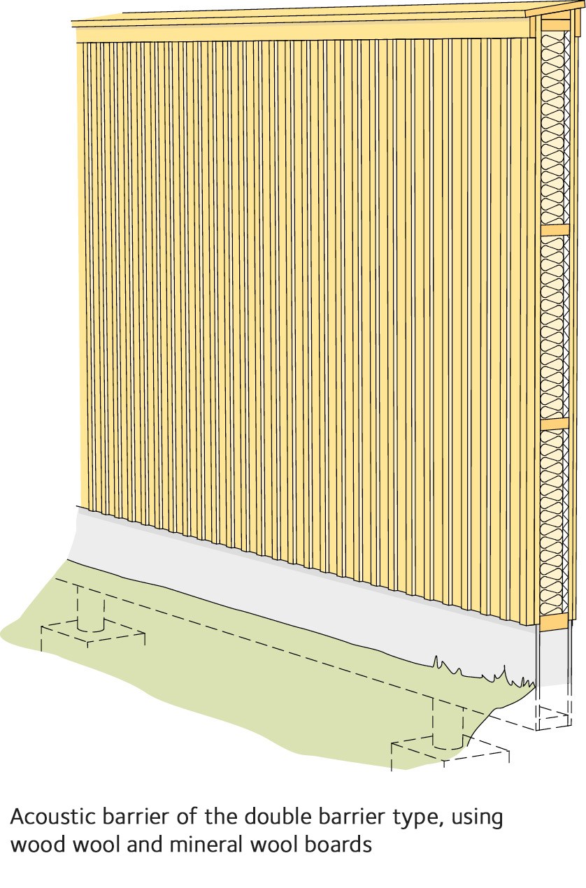In practice, a reduction of at least 20–25 dB is required. This can be achieved with wooden structures, particularly where barriers with double panels are used.