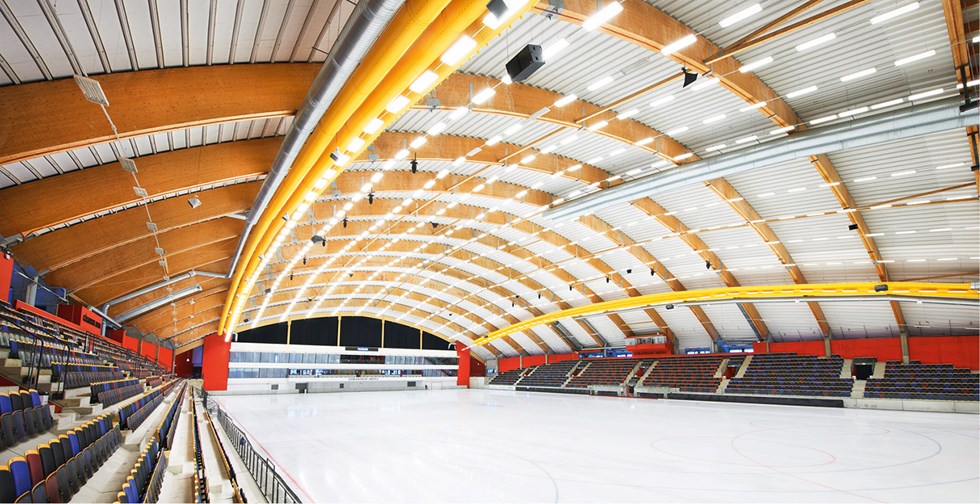Glulam is one of the strongest construction materials, allowing for large spans with no posts blocking the view, as in Göransons Arena in Sandviken, built in 2009.