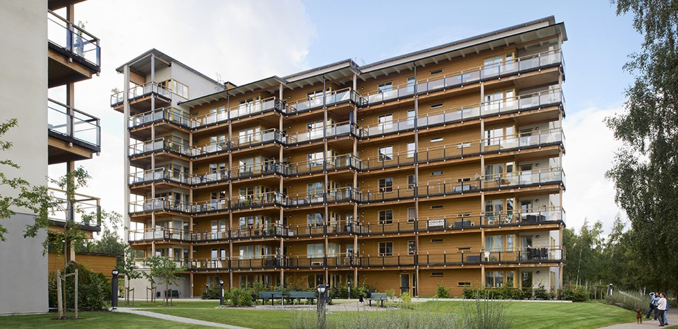 It doesn’t always show on the outside, but wood is now the most common material for the structural frame in newbuild housing in Sweden. There are major savings to be made by using modern industrial construction techniques. Since the modules are prefabricated off-site, a five-storey building can be assembled in just 10 weeks, once the foundation slab has been cast. A prime example is this four-storey building with a wooden structural frame in Nynäshamn outside Stockholm.