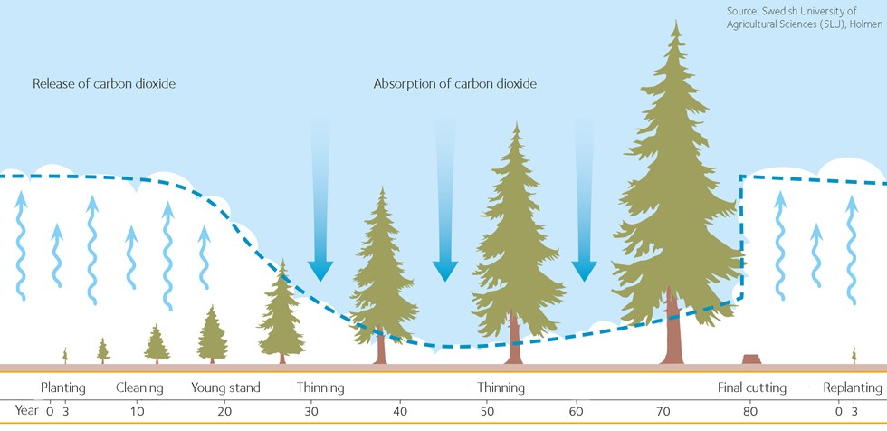 Fig. 9 Wood is naturally climate neutral. Directly after felling, the cleared area leaks carbon dioxide as needles and discarded branches decay. Once the new trees reach a little over 20 years old, they are able to absorb more carbon dioxide than is leaking from the ground. The trees are harvested in maturity and then processed into products that are able to replace products and energy sources that are harmful to the climate. Making use of the forest is therefore good for the climate.