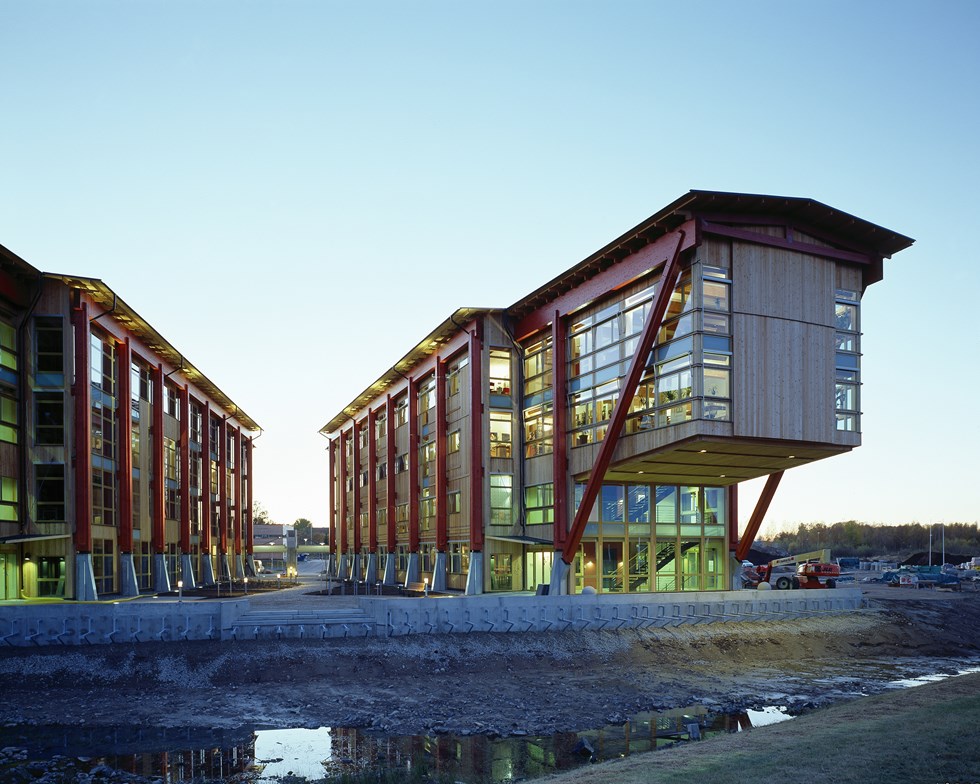 Using wood in the construction is a way to achieve a working space that suits all needs. Large office buildings erected in densely populated urban areas can benefit from off-site production of engineered timber. The building process is quick and efficient with less noise pollution.