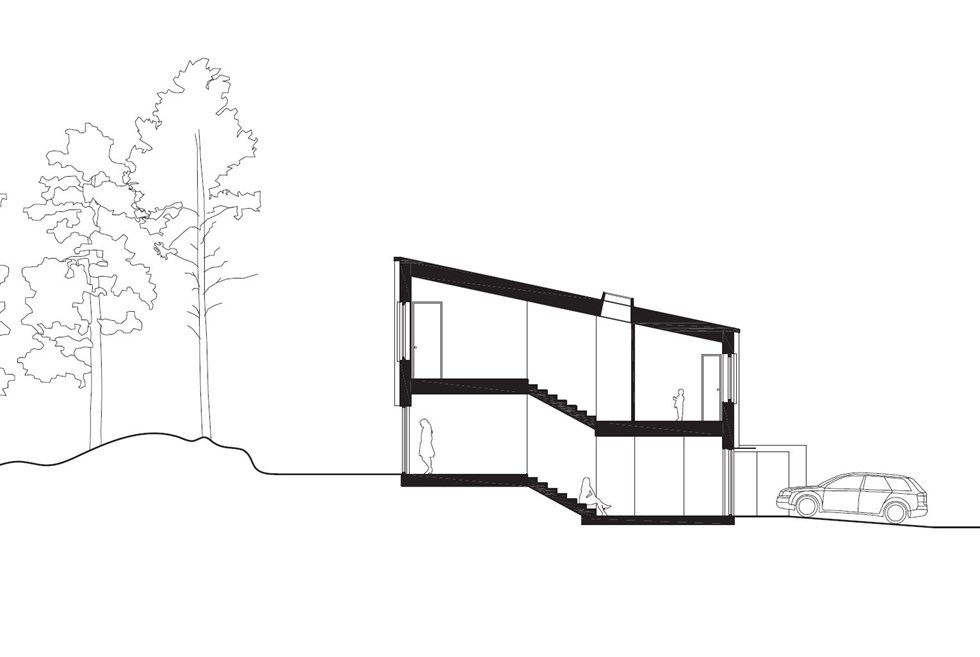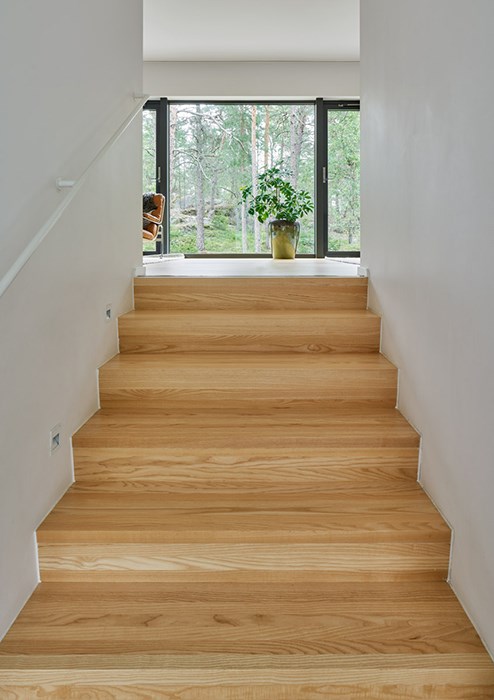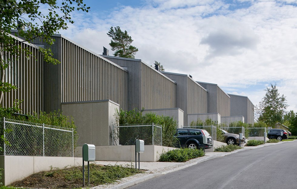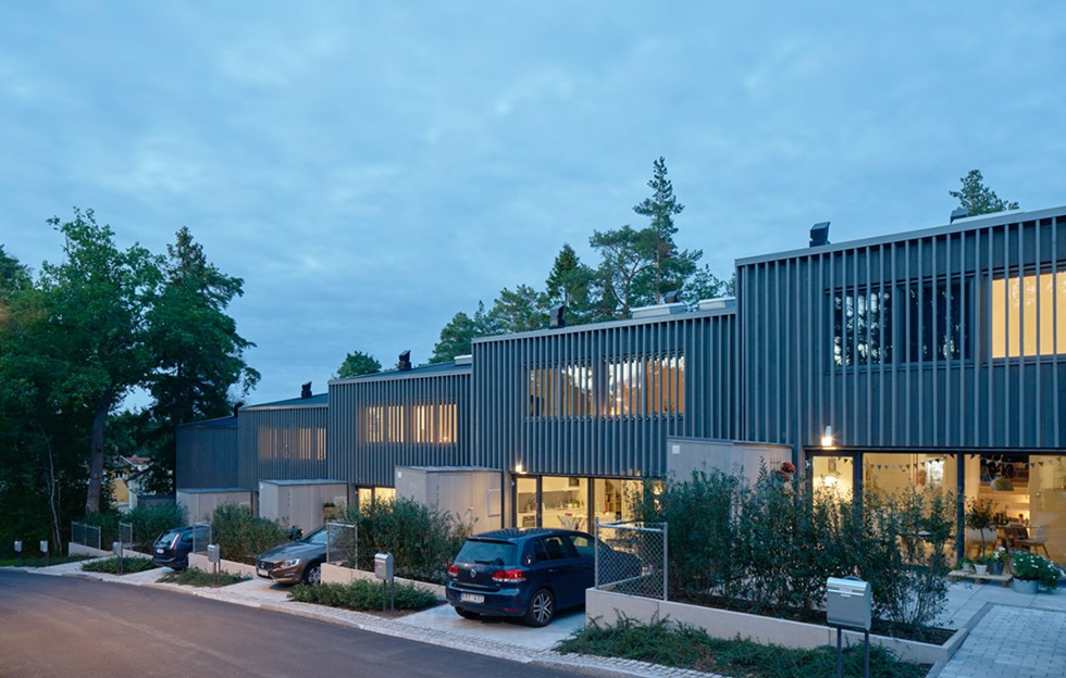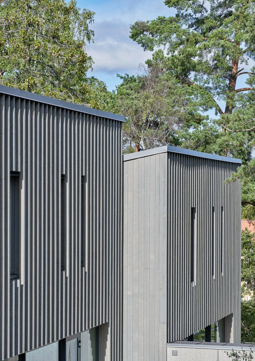 A word from the architect Wood has been the main theme throughout the process. The 12 terraced houses started out as an initiative by the architects, before the building contractor was selected. Initially, the project was named Furuhusen (or pine house). The houses form a bridge between nature and the city. The twelve terraced houses stand in two rows along a street in Bagarmossen. The rear of the houses looks over the Nacka nature reserve, with its hills and pine forest. The floor plan, spread over four half-floors, has been designed to harmonise with nature and topography. The timber, not least the grid façade, appear both open and closed, evocative of walking among the pines while at the same time reinforcing the connection to the street as a social meeting place.